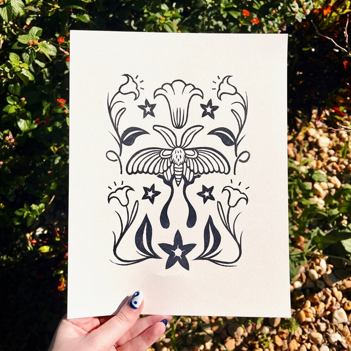 My original Angel Eye linocut design hand printed on speedball printmaking paper. Size 8.5” x 11”