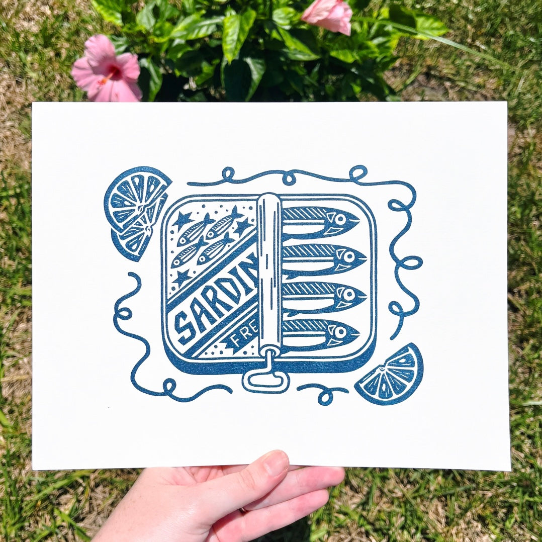 My original Sardines with Lemon linocut design hand printed on speedball printmaking paper with blue ink. Size 8.5” x 11”